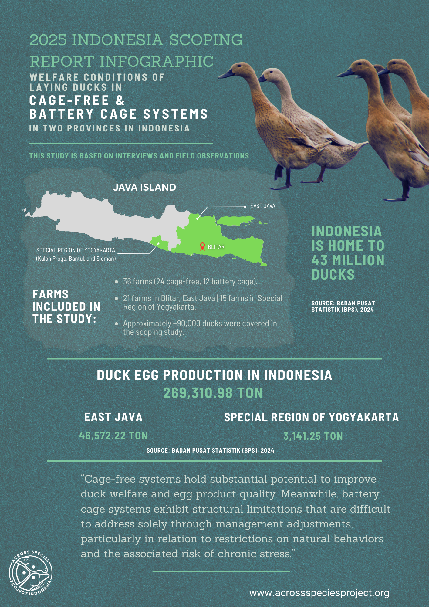 Across Species Project Indonesia (ASPI) aims to improve the welfare of farmed animals, particularly laying ducks, by promoting sustainable farming practices that prioritize animal welfare in Indonesia. This report is part of ASPI’s ongoing efforts to understand and enhance the welfare conditions of laying ducks across different farming systems. We assessed 36 farms in East Java and the Special Region of Yogyakarta, covering both battery cage and cage-free systems. In East Java, data collection focused on Blitar Regency—an area with the highest duck egg production in the province, where total duck egg production reaches 46,572 tons. This study included 8 battery cage farms and 13 cage-free farms across four sub-districts: Ponggok, Nglegok, Kademangan, and Wlingi. In the Special Region of Yogyakarta, a province with approximately 3,141 tons of duck egg production, the study covered three regencies (Kulon Progo, Bantul, and Sleman), comprising 4 battery cage farms and 11 cage-free farms.